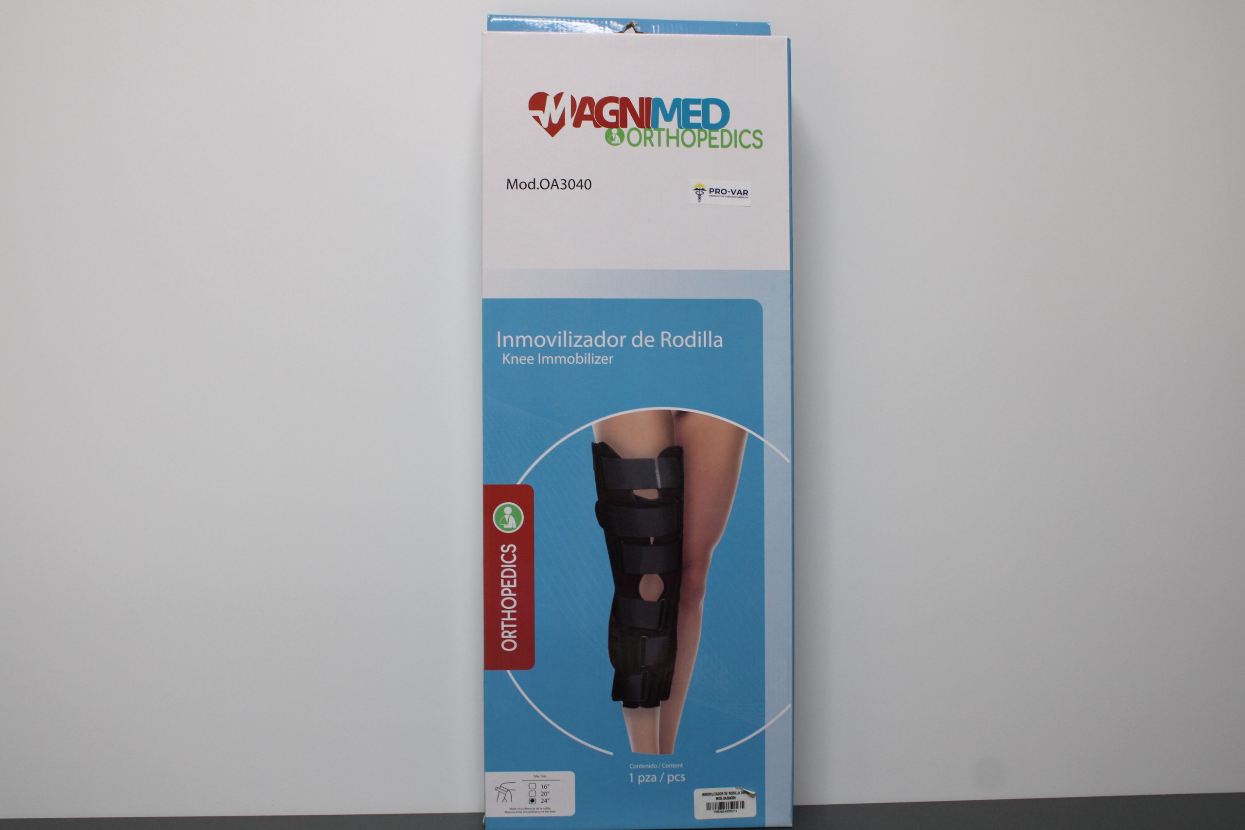 Dispositivo ortopédico diseñado para inmovilizar y estabilizar la articulación de la rodilla. Proporciona soporte rígido mediante varillas laterales y sistema de ajuste con correas para restricción controlada del movimiento durante la recuperación.